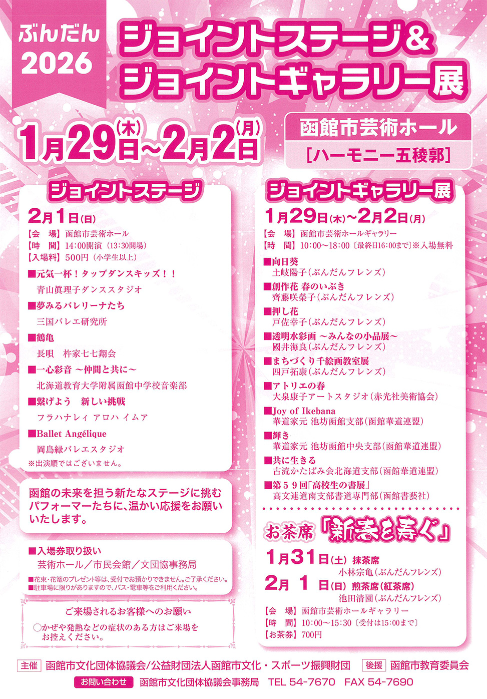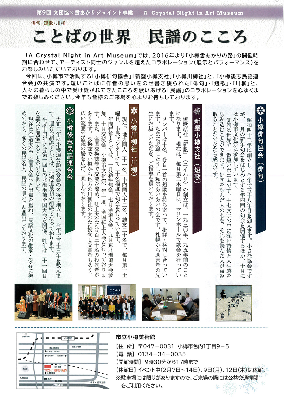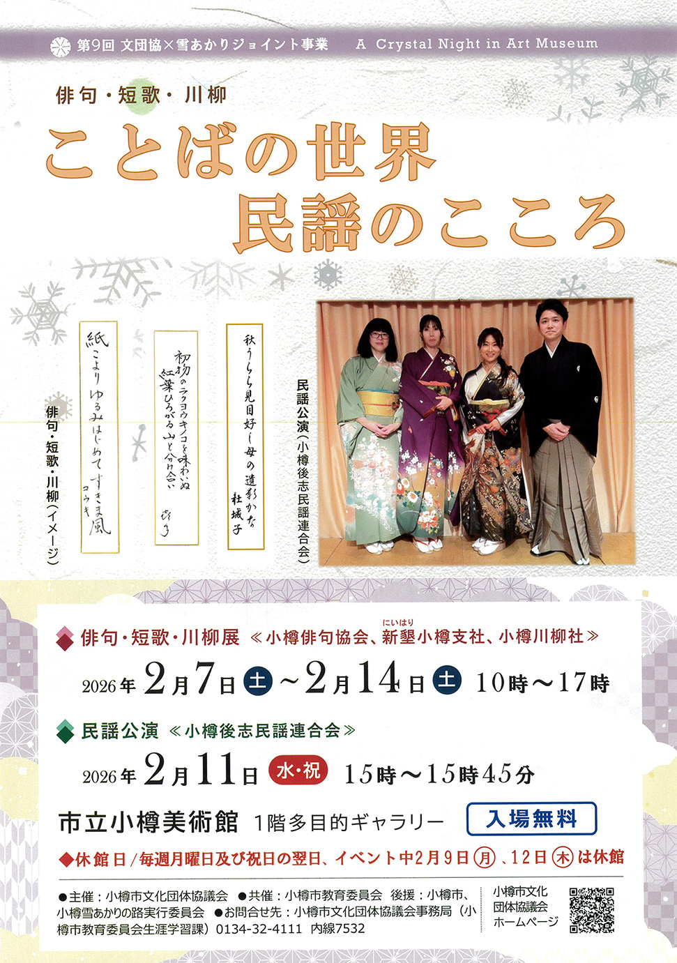今回は、小樽市で活動する「小樽俳句協会」「新墾小樽支社」「小樽川柳社」と、「小樽後志民謡連合会」の共演です。短いことばに作者の思いをのせ書き綴られた「俳句」・「短歌」・「川柳」と、人々の暮らしの中で受け継がれてきたこころを歌いあげる「民謡」のコラボレーションを心ゆくまでお楽しみください。今年も皆様のご来場を心よりお待ちしております。